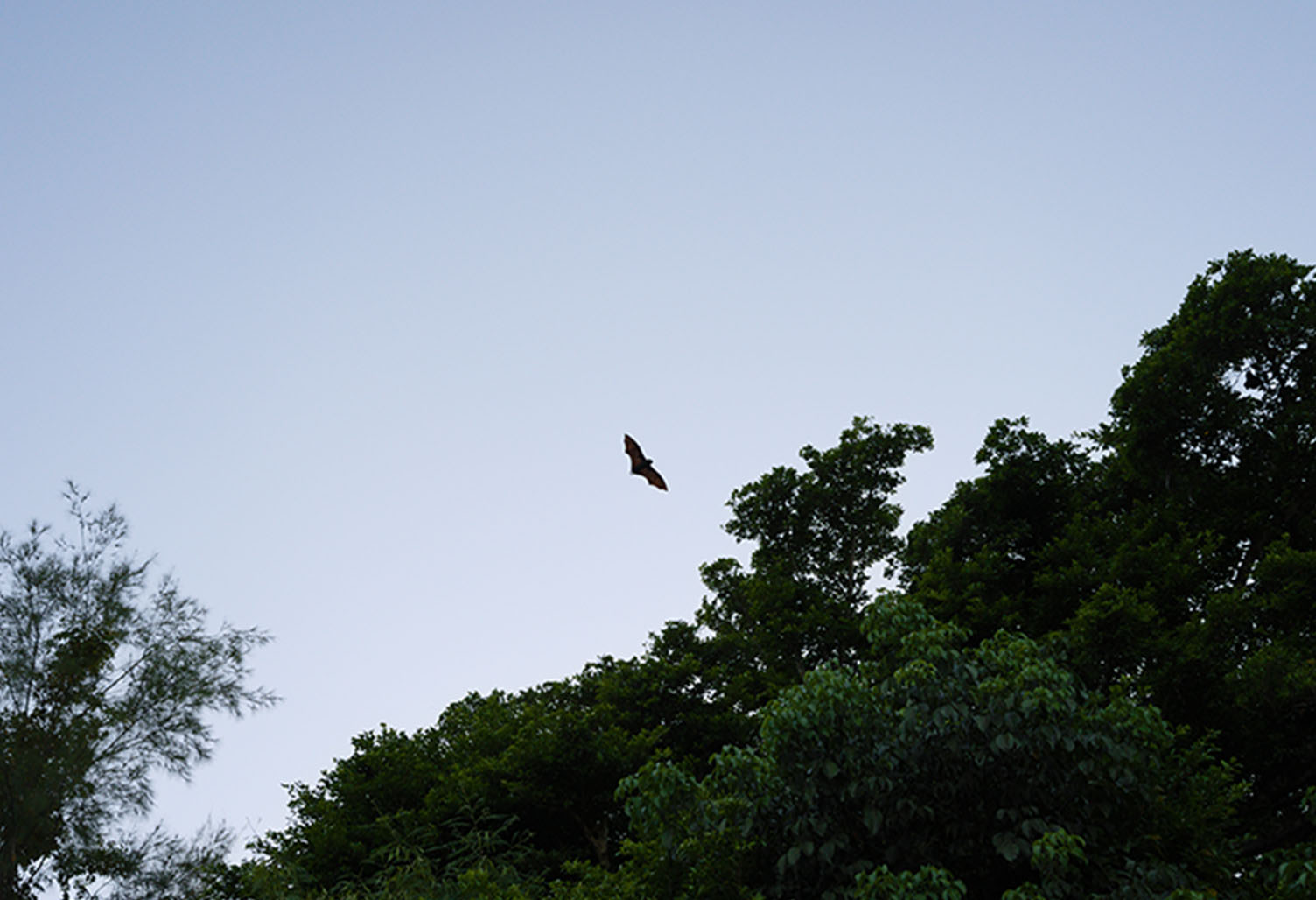 オガサワラオオコウモリですね。日が暮れると、目を覚ましたコウモリたちがエサを食べに木々に集まってくるのですが、数が増えるにつれて奪い合いが始まって。そのときの、喧嘩のような甲高い「キーキー」という声が印象的でした。夜を楽しんでいるかのようで、「あんなに騒ぐんだ」と驚きましたね。